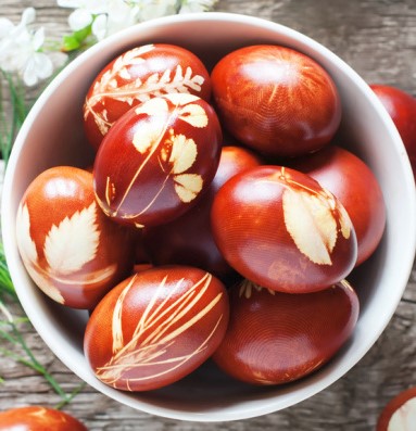 - Potom vajíčka vytáhněte, osušte a vybalte z punčoch. Po odloupnutí zanechají lístečky na vajíčkách obtisky.